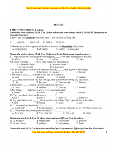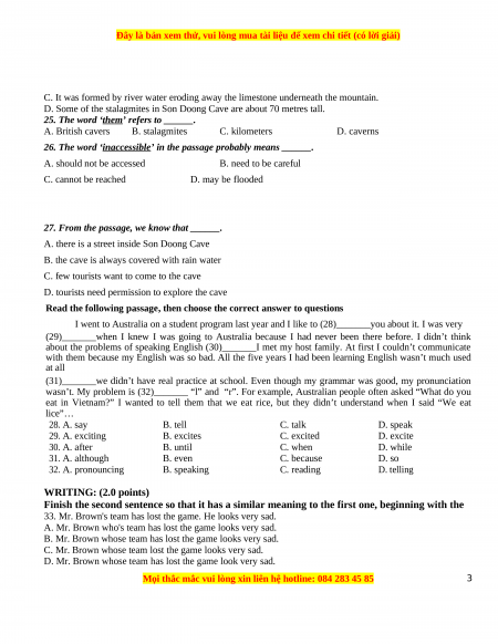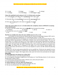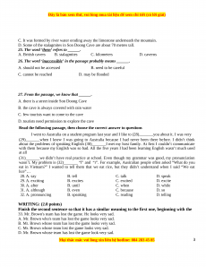 eat in Vietnam?” I wanted to tell them that we eat rice, but they didn’t understand when I said “We eat lice”… 28. A. say B. tell C. talk D. speak 29. A. exciting B. excites C. excited D. excite 30. A. after B. until C. when D. while 31. A. although B. even C. because D. so 32. A. pronouncing B. speaking C. reading D. telling WRITING: (2.0 points)