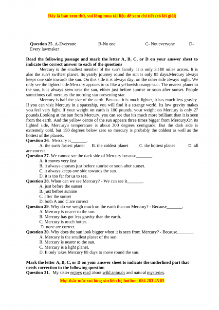 Question 28. When can we see Mercury? - We can see it_______. A. just before the sunset B. just before sunrise C. after the sunset D. both A and C are correct