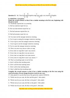 Question 32. Mr. Thach who sing English songs very well is my teacher of English. A B C D II. WRITING: (2.0 points)