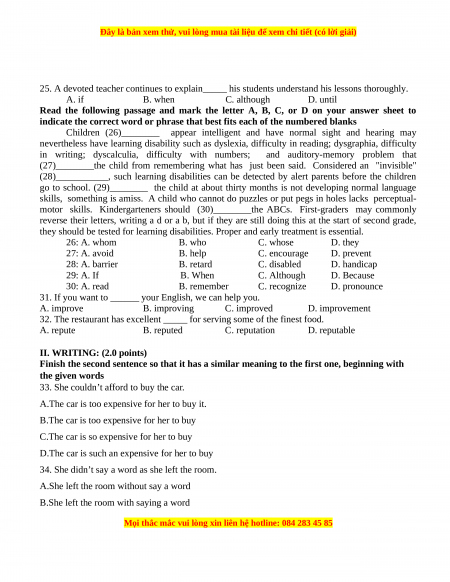they should be tested for learning disabilities. Proper and early treatment is essential. 26: A. whom B. who C. whose D. they 27: A. avoid B. help C. encourage D. prevent 28: A. barrier B. retard C. disabled D. handicap 29: A. If B. When C. Although D. Because 30: A. read B. remember C. recognize D. pronounce