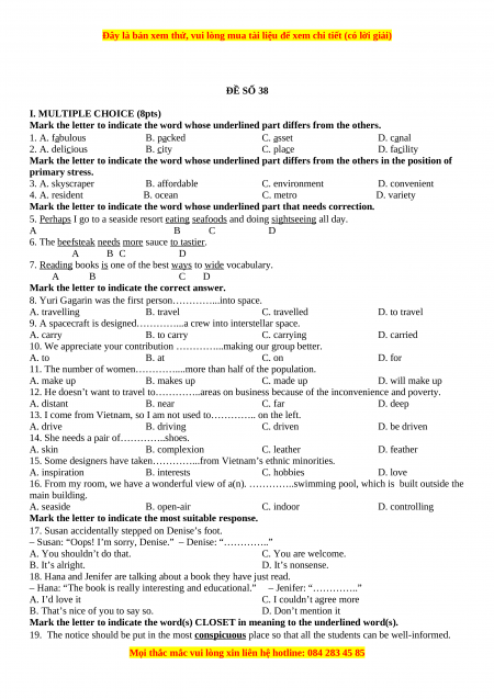 ĐỀ SỐ 38 I. MULTIPLE CHOICE (8pts)