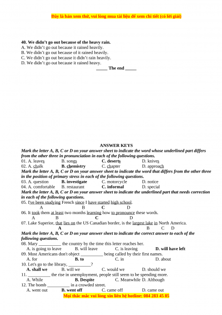 D. We didn’t go out because it rained heavy. _____ The end _____ ANSWER KEYS