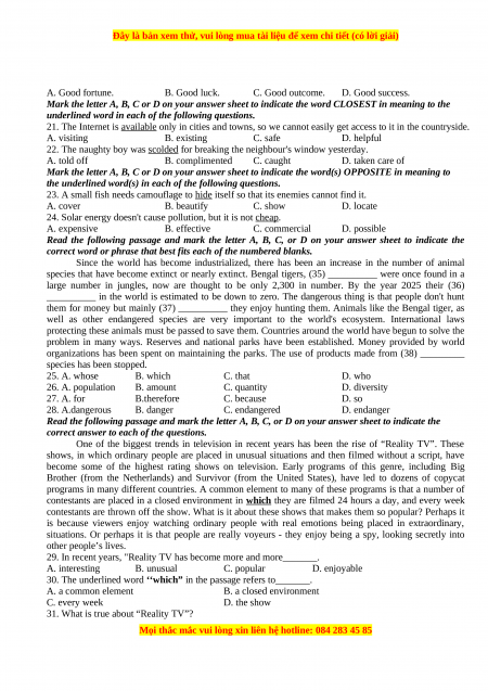organizations has been spent on maintaining the parks. The use of products made from (38) _________ species has been stopped. 25. A. whose B. which C. that D. who 26. A. population B. amount C. quantity D. diversity 27. A. for B.therefore C. because D. so 28. A.dangerous B. danger C. endangered D. endanger