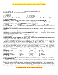 after, factory (27)_________ in the US and Europe began wearing jeans. Young people usually didn’t wear them. Question 23: A. rich B. old C. young D. poor Question 24: A. start B. starts C. was starting D. started Question 25: A. call B. calls C. calling D. called Question 26: A. famous B. popular C. good D. wonderful Question 27: A. workers B. drivers C. cowboys D. fanners