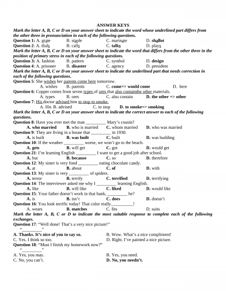 Question 18: “Must I finish my homework now?” “_________” A. Yes, you may. B. Yes, you need. C. No, you can’t. D. No, you needn’t.