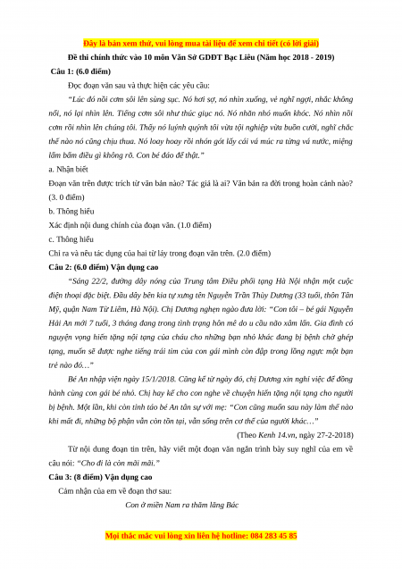 Đề thi chính thức vào 10 môn Văn Sở GDĐT Bạc Liêu (Năm học 2018 - 2019) Câu 1: (6.0 điểm)