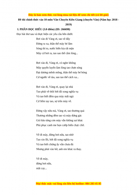Đề thi chính thức vào 10 môn Văn Chuyên Kiên Giang (chuyên Văn) (Năm học 2018 -