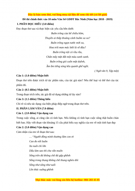 Đề thi tuyển sinh chính thức vào 10 môn Ngữ Văn năm 2018 - 2019 có đáp án - Sở GDĐT Bắc Ninh