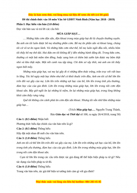Đề thi tuyển sinh chính thức vào 10 môn Ngữ Văn năm 2018 - 2019 có đáp án - Sở GDĐT Ninh Bình