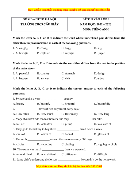 SỞ GD – ĐT TP. HÀ N I Ộ Đ Ề THI VÀO L P Ớ 6 TRƯ NG Ờ THCS C U Ầ GI Y Ấ NĂM H C: Ọ 2022 – 2023 MÔN: TI NG Ế ANH