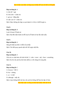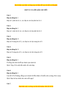 Đáp án C phát âm là /ai/, các đáp án còn l i ạ phát âm là /i/ Câu 3. Đáp án đúng là: D Đáp án D tr ng ọ âm s ố 2, các đáp án còn l i ạ tr ng ọ âm s ố 1 Câu 4. Đáp án đúng là: D Đáp án D tr ng ọ âm s ố 2, các đáp án còn l i ạ tr ng ọ âm s ố 1 Câu 5. Đáp án đúng là: C Ô trống c n ầ tính t ừ đ ể t o ạ thành c m ụ danh từ D c ị h: Th y ụ Sĩ là m t ộ đ t ấ nư c ớ r t ấ xinh đ p ẹ . Câu 6. Đáp án đúng là: C Câu h i ỏ v ề s ố lư ng, ợ đ ng ằ sau là danh t ừ đ m ế đư c ợ s ố nhi u ề nên ta dùng: How many D c ị h: B n ạ ăn bao nhiêu bát c m ơ m i ỗ ngày? Câu 7. M i