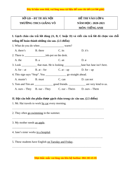 - Đề thi tuyển sinh chính thức vào lớp 6 môn Tiếng Anh trường THCS Giảng Võ năm 2020.