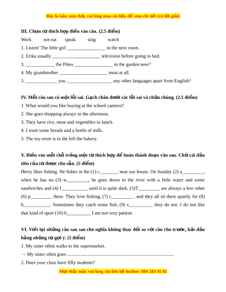 5. _____________ you ___________________ any other languages apart from English? IV. M i ỗ câu sau có m t ộ l i ỗ sai. G c ạ h chân dư i ớ các l i ỗ sai và ch a ữ chúng. (2.5 đi m ể )