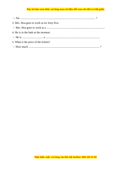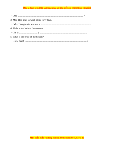 mustn’t + Vinf: không đư c ợ phép làm gì D c ị h: Bi n ể hi u ệ này cho bi t ế "D ng ừ l i" ạ . B n ạ không đư c ợ đi th ng ẳ v ề phía trư c ớ . Câu 5. Đáp án đúng là: B Ô trống s ố 1 c n ầ tính t ừ s ở h u ữ vì đ ng ằ sau là danh t . ừ Ô tr ng ố s ố 2 c n ầ đ i ạ t ừ làm ch ủ ngữ D c ị h: Tom và Tim là b n ạ t t ố c a ủ chúng tôi. H ọ r t ấ t ử t ế v i ớ chúng tôi. II. Đ t ặ câu h i ỏ cho ph n ầ đư c ợ g c ạ h chân. (2.5 đi m ể ) Câu 1.