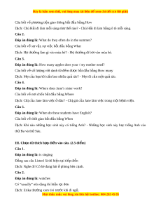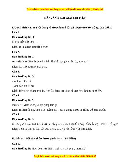 ệ đ xe ể m chi ti t ế (có l i ờ gi i ả ) ĐÁP VÀ VÀ L I Ờ GI I Ả CHI TI T Ế I. G c ạ h chân câu tr ả l i ờ đúng và vi t ế câu tr ả l i ờ đã ch n ọ vào ch ỗ tr n ố g. (2.5 đi m ể ) Câu 1. Đáp án đúng là: D Mô tả th i ờ ti t: ế It’s … D c ị h: B n ạ làm gì khi tr i ờ nóng? Câu 2. Đáp án đúng là: C An + danh t ừ đ m ế đư c ợ s ố ít b t ắ đ u ầ b ng ằ nguyên âm (u, e, o, a, i) D c ị h: Có m t ộ l ọ m c ự trên bàn. Câu 3. Đáp án đúng là: B - look at: nhìn vào - look for: tìm ki m ế D c