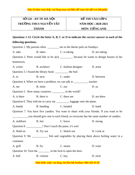 SỞ GD – ĐT TP. HÀ N I Ộ Đ Ề THI VÀO L P Ớ 6 TRƯ NG Ờ THCS NGUY N Ễ T T Ấ NĂM H C: Ọ 2020-2021 THÀNH MÔN: TI NG Ế ANH