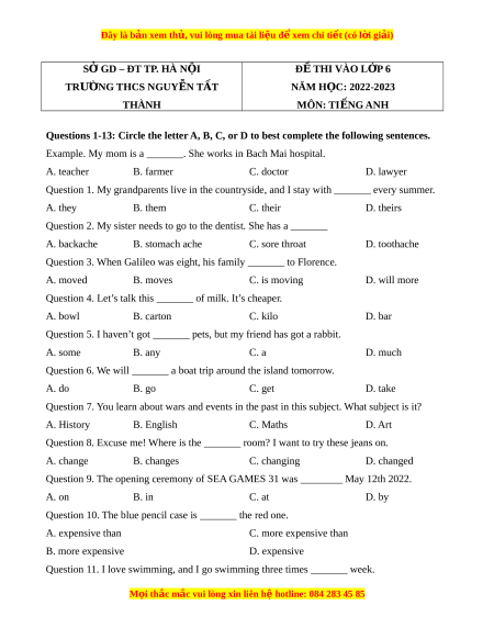 - Đề thi tuyển sinh chính thức vào lớp 6 môn Tiếng Anh trường THCS Nguyễn Tất Thành năm 2022.