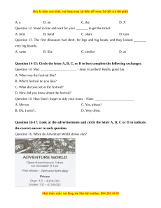 Question 14. Mai: _____________________ - Jane: Excellent! Really good fun. A. What was the festival like? B. Which festival do you like?