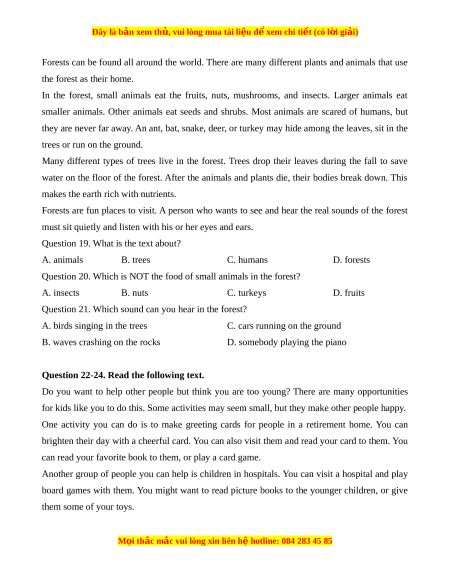 Question 20. Which is NOT the food of small animals in the forest? A. insects B. nuts C. turkeys D. fruits