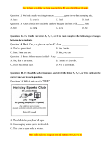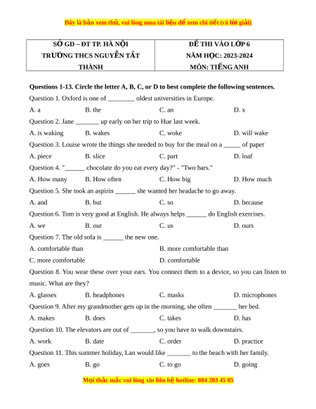 SỞ GD – ĐT TP. HÀ N I Ộ Đ Ề THI VÀO L P Ớ 6 TRƯ NG Ờ THCS NGUY N Ễ T T Ấ NĂM H C: Ọ 2023-2024 THÀNH MÔN: TI NG Ế ANH