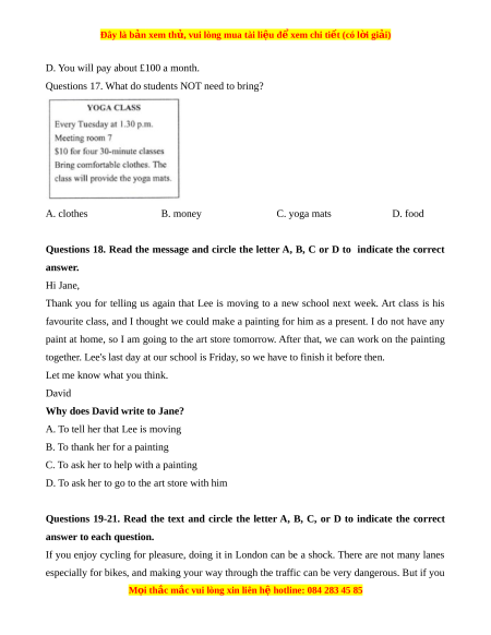 Questions 17. What do students NOT need to bring? A. clothes B. money C. yoga mats D. food