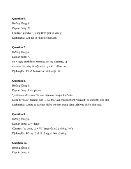 Dịch nghĩa: Mẹ tớ thường đánh răng vào buổi sáng. Question 4. Hướng dẫn giải: Đáp án đúng: A
