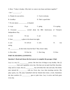 she does aerobics (5) ___________ goes to judo class. Lucy is active and feels great every day. 1. A. healthy B. health C. unhealthy D. healthily 2. A. will cat B. is eating C. ate D. eats 3. A. always B. usually C. never D. often 4. A. on B. of C. at D. for 5. A. but B. or C. so D. because