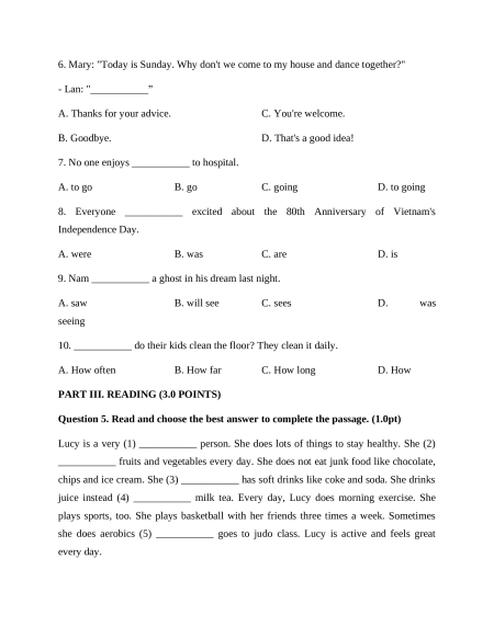 6. Mary: "Today is Sunday. Why don't we come to my house and dance together?" - Lan: "___________” A. Thanks for your advice. C. You're welcome. B. Goodbye. D. That's a good idea!