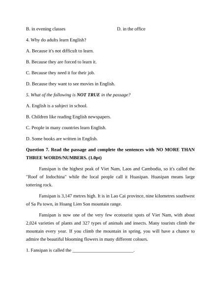Question 6. Read the following passage and choose the correct answer A, B, C or D. (1.0pt)