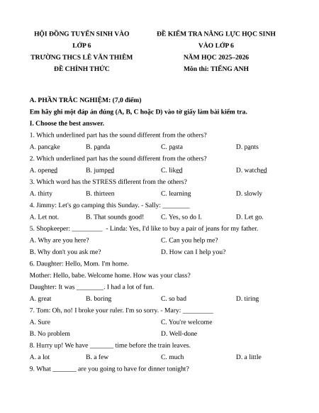 - Đề thi tuyển sinh chính thức vào lớp 6 môn Tiếng Anh trường Lê Văn Thiêm (Hà Tĩnh) 2025.