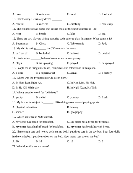 16. Where was the President Ho Chi Minh born? A. In Nam Dan, Nghe An. C. In Kim Lien, Ha Noi. D. In Ho Chi Minh city. B. In Nghi Xuan, Ha Tinh.