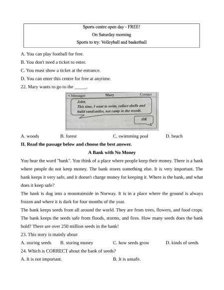 hold? There are over 250 million seeds in the bank! 23. This story is mainly about A. storing seeds B. storing money C. how seeds grow D. kinds of seeds