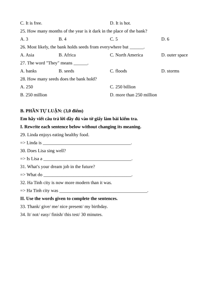 Đề thi tuyển sinh vào lớp 6 Tiếng Anh 2025 trường Lê Văn Thiêm (Hà Tĩnh)