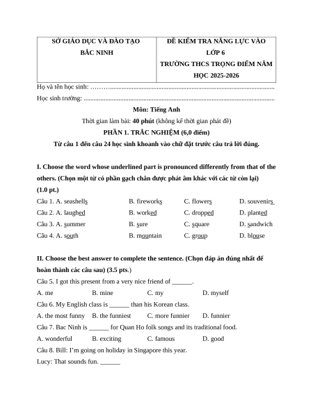 - Đề thi tuyển sinh chính thức vào lớp 6 môn Tiếng Anh trường Trọng điểm Bắc Ninh 2025.