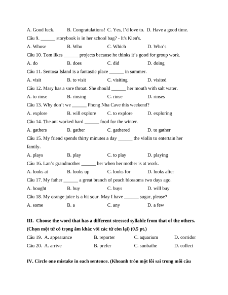 (Chọn một từ có trọng âm khác với các từ còn lại) (0.5 pt.) Câu 19. A. appearance B. reporter C. aquarium D. corridor Câu 20. A. arrive B. prefer C. sunbathe D. collect