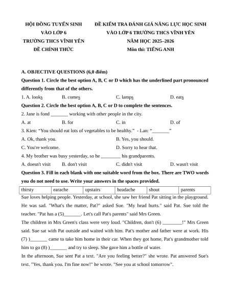 TRƯỜNG THCS VĨNH YÊN NĂM HỌC 2025–2026 ĐỀ CHÍNH THỨC Môn thi: TIẾNG ANH