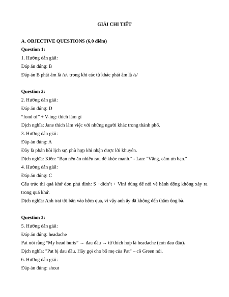 A. OBJECTIVE QUESTIONS (6,0 điểm) Question 1: 1. Hướng dẫn giải: Đáp án đúng: B