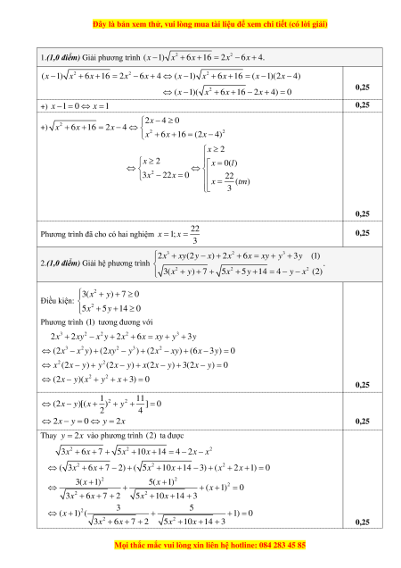 Vậy hệ phương trình có nghiệm ( ; x y) = ( 1 − ; 2 − ) 0,25