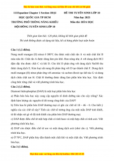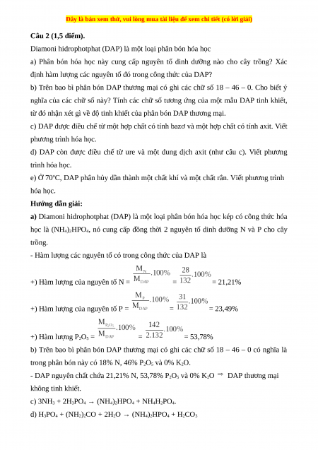 e) Ở 70oC, DAP phân hủy dần thành một chất khí và một chất rắn. Viết phương trình hóa học. Câu 3 (1 điểm).
