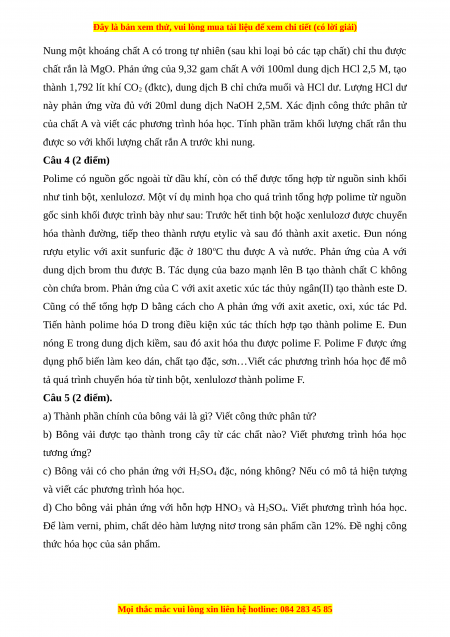 tả quá trình chuyển hóa từ tinh bột, xenlulozơ thành polime F. Câu 5 (2 điểm).