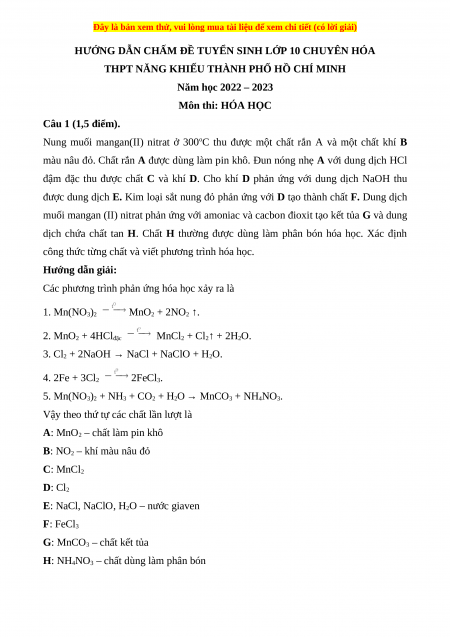HƯỚNG DẪN CHẤM ĐỀ TUYỂN SINH LỚP 10 CHUYÊN HÓA