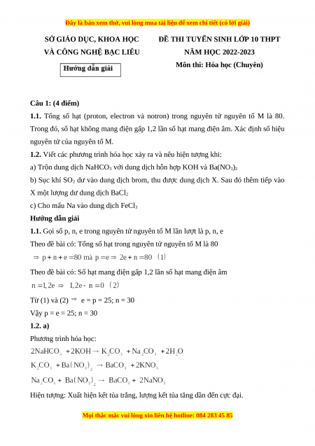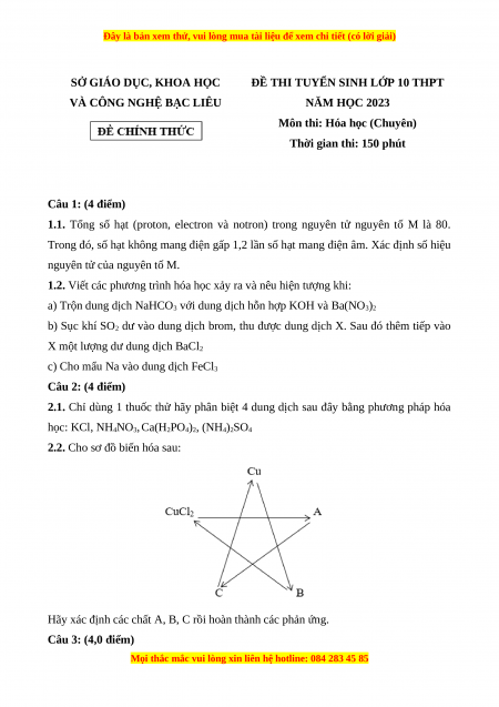 Đề thi vào 10 môn Hóa học năm 2023 - Trường THPT Chuyên Bạc Liêu