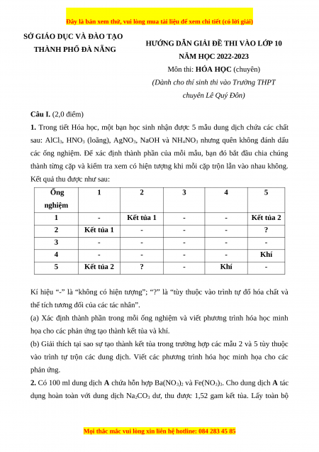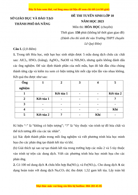Đề thi vào 10 môn Hóa học năm 2023 - Trường THPT Chuyên Đà Nẵng
