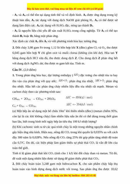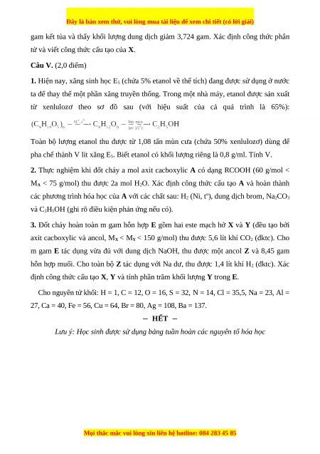 Lưu ý: Học sinh được sử dụng bảng tuần hoàn các nguyên tố hóa học