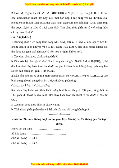 thu được 15,68 lít CO2 và 13,5 gam H2O. Tìm công thức phân tử và viết công thức cấu tạo của U và V. Câu 5 (2,0 điểm)