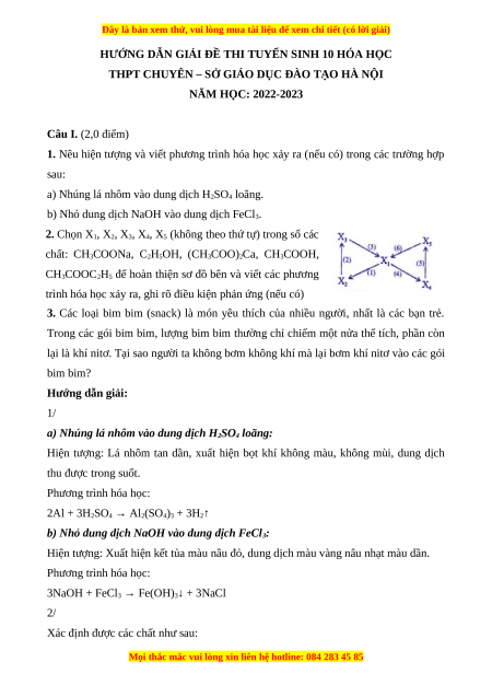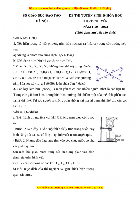 ĐỀ THI TUYỂN SINH 10 HÓA HỌC HÀ NỘI THPT CHUYÊN NĂM HỌC: 2023