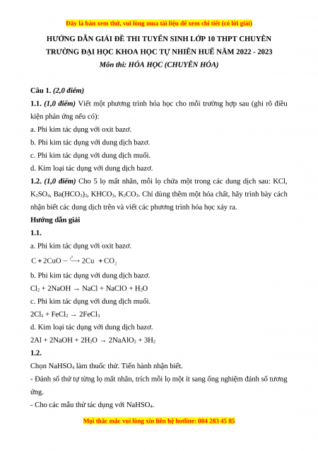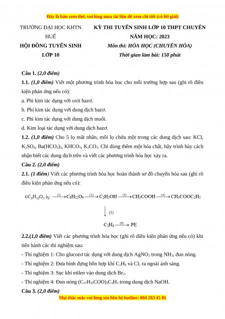 Đề thi vào 10 môn Hóa học năm 2023 - Trường THPT Chuyên Huế