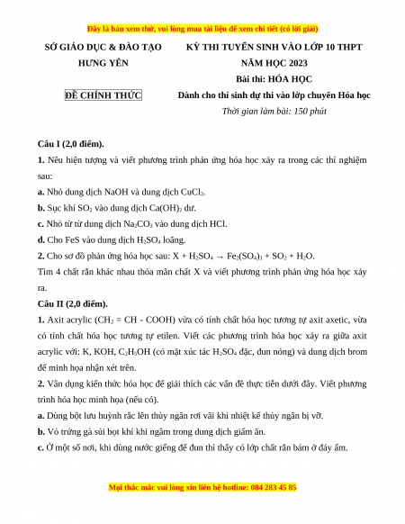 Đề thi vào 10 môn Hóa học năm 2023 - Trường THPT Chuyên Hưng Yên