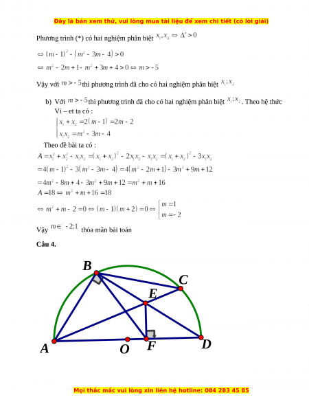 thì phương trình đã cho có hai nghiệm phân biệt . Theo hệ thức Vi – et ta có : Theo đề bài ta có : Vậy thỏa mãn bài toán Câu 4. B C E A F D O
