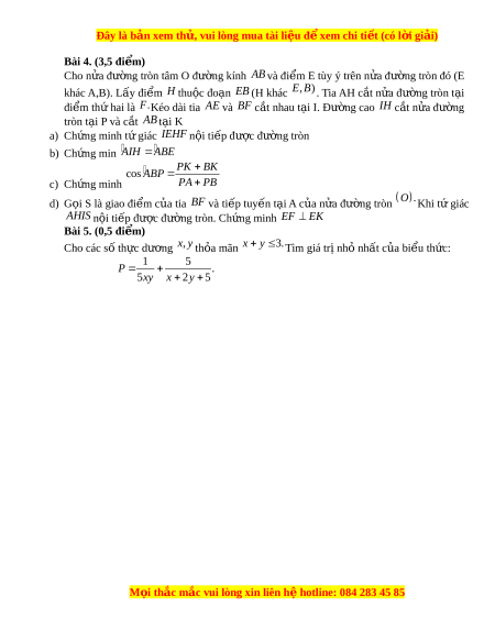 ệ xem ể chi ti t ế (có l i ờ gi i ả ) Bài 4. (3,5 đi m ể ) Cho n a đ ử ư ng t ờ ròn tâm O đư ng kí ờ nh AB và đi m ể E tùy ý trên n a đ ử ư ng t ờ ròn đó (E khác A,B). L y đi ấ m ể H thu c ộ đo n